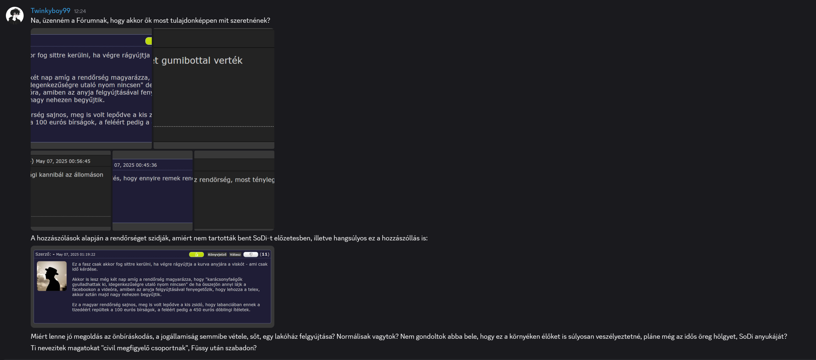 Tovább még nem görgettem, de nem tudjuk mivel lett bejelentve. Gondolom garázdaság, közveszély, ilyesmi. És hogy lehet van nála fegyver. Ilyenkor nem 1 ember fog odamenni, nyilván többen, és nem nagyon fogják megkérdezni senkitől (ahogy a Jenesnél is láttuk), hogy ráér-e elbeszélgetni urunkról és megváltónkról...