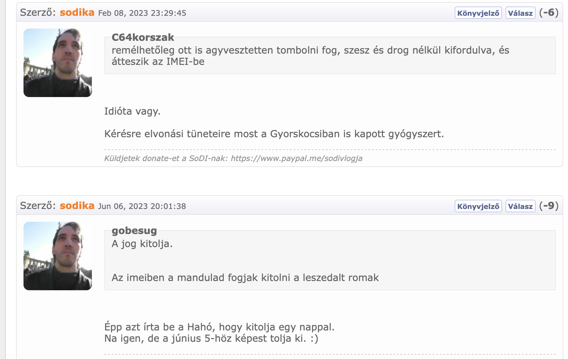 Így volt ez az angliai Alien baba vásárláskor, így volt ez a szélsőséges blogoláskor, akikor a Szetey montázs miatt még az ország miniszterelnöke is róla beszélt, meg Morvaiék is 1-2x nyilvánosan megdicsérték a tevékenységét, így volt ez Németországban, Ausztriában, amikor kétségtelenül elég sokat keresett. De így volt még a macskaólban is, az egérrágta, szakadozott szalmazsákon, egy húgyszagú, penészes, okádék cigányputriban, az emberi lét legalján, mert még akkor is azt mantrázta, hogy őrá irigyek, mert érdemi tevékenység, munka nélkül el tud tengeni-lengeni, vegetálni, mert a létminimumhoz valamennyit donate-elnek neki.
