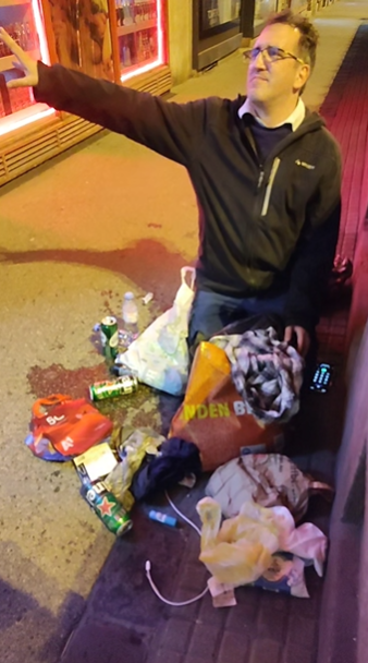 Beszarok, és még ott is cipeli magával a szemetét csöves nejlonszatyorban. Mi lehet a zacskóban? HDMI kábelek?